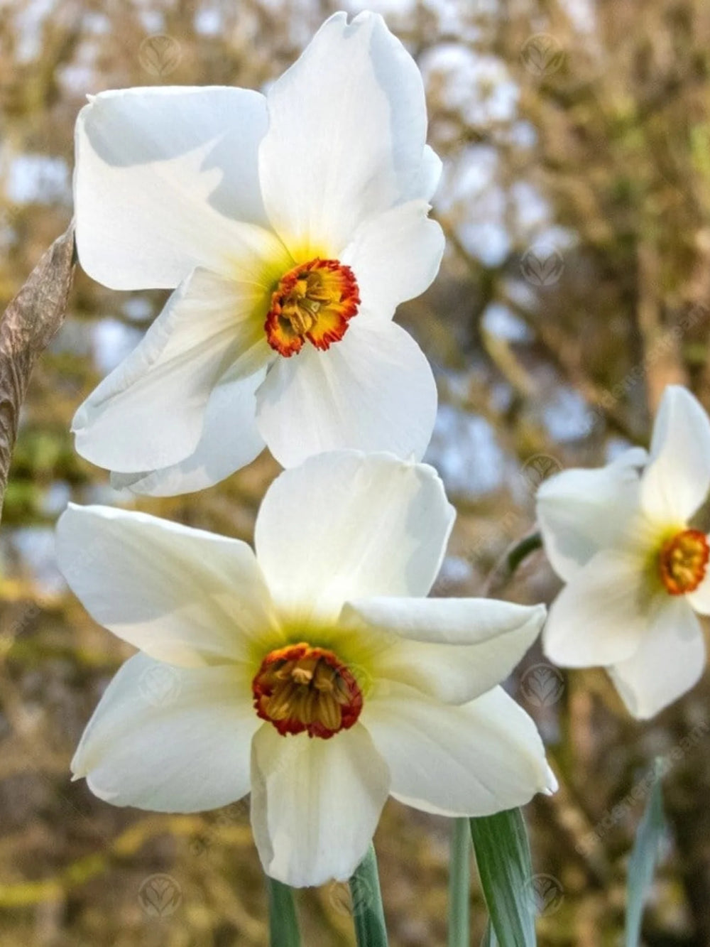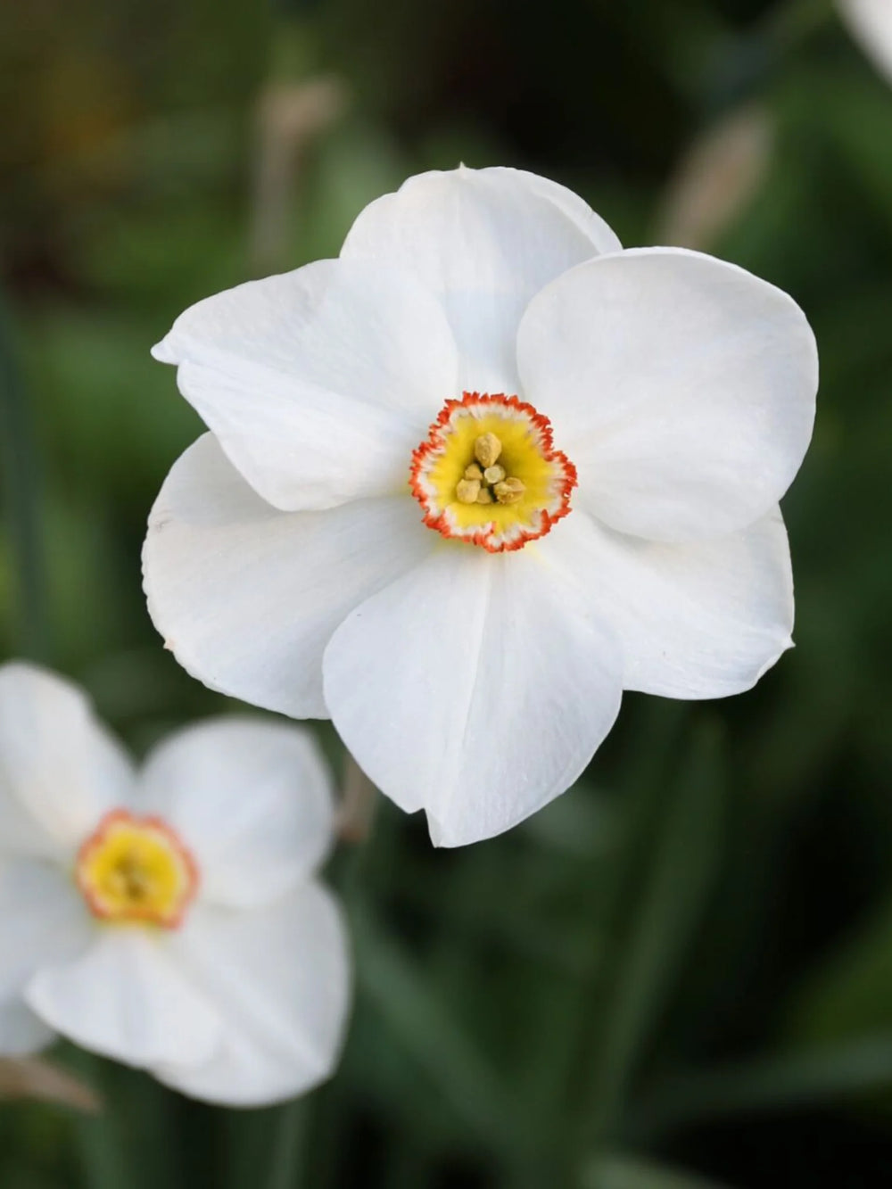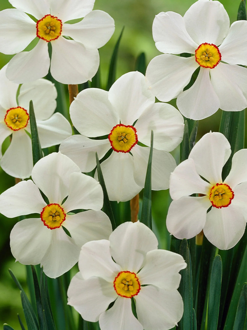 Bulbi narcise Actaea atrag prin florile albe elegante, cu centru galben și margine roșiatică delicată, oferind un aspect clasic și parfumat grădinii.
